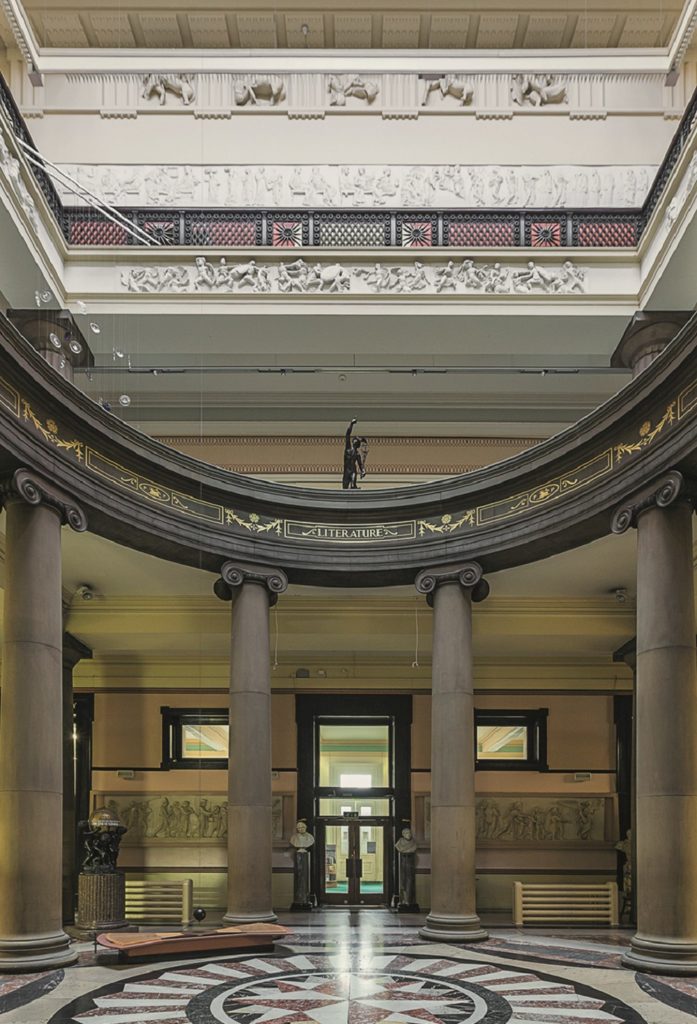 Beneath the pediment is the inscription ‘To Literature, Arts and Science’ reflecting the purpose of the building and the interests of its principal benefactor Edmund Robert Harris. Around the sides of the building Hibbert chose to inscribe ‘On Earth there is nothing great but man : in man there is nothing great but mind’, ‘Reverence in man, that which is supreme’ taken from the meditations of Marcus Aurelius and lastly the promise ‘The mental riches you may here acquire abide with you always’. A further inscription exists around the lantern in ancient Greek taken from the funeral of Pericles, a ruler of Athens who is the central figure depicted in the pediment sculpture on the front of the building.