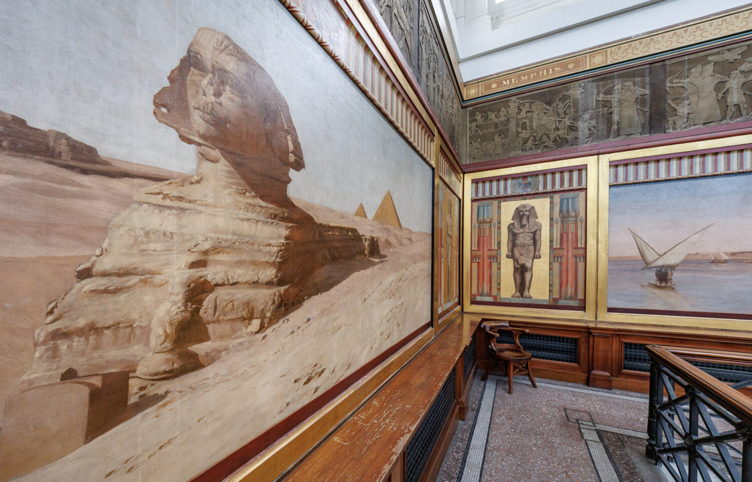 In 1908, The Harris commissioned artist John Somerscales to create one of the most unique features of the building, the Egyptian Balcony . A series of painted murals inspired by a research trip to Egypt, which includes key historical sites and interpretations of ancient tomb paintings – the organisations first art commission.