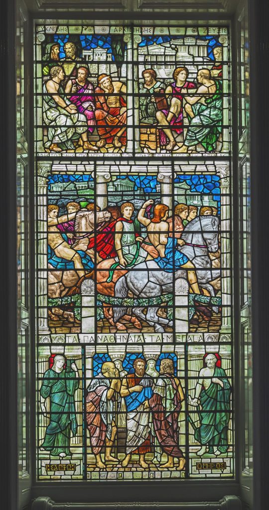 The monumental figure group on the pediment of the building was sculpted by E. Roscoe Mullins. It represents famous figures from the Hellenistic era with Pericles, commander, statesman and orator, at the centre surrounded by distinguished contemporaries such as Sophocles and Socrates. The father of history, Herodtous, reclines on the far left, his books beside him. Ictinus, the architect of the Parthenon, is shown with a plan of the Temple. Below the pediment is an inscription adapted by Byron from Pericles funeral oration which reinforces the central role of classical culture in the founding of the building. ‘The dead but sceptred Sovrans, who still rule Our spirits from their urns’.